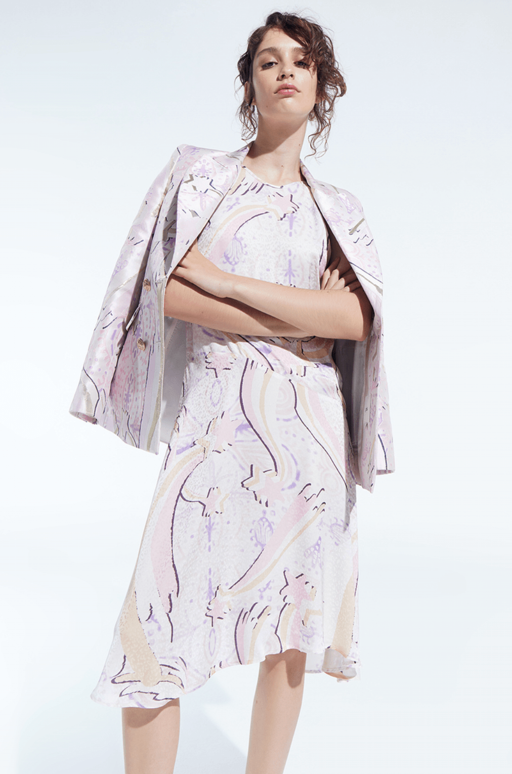 The Constelar dress is made with an exclusive print from the collection. It features a low neckline and off-the-shoulder design.