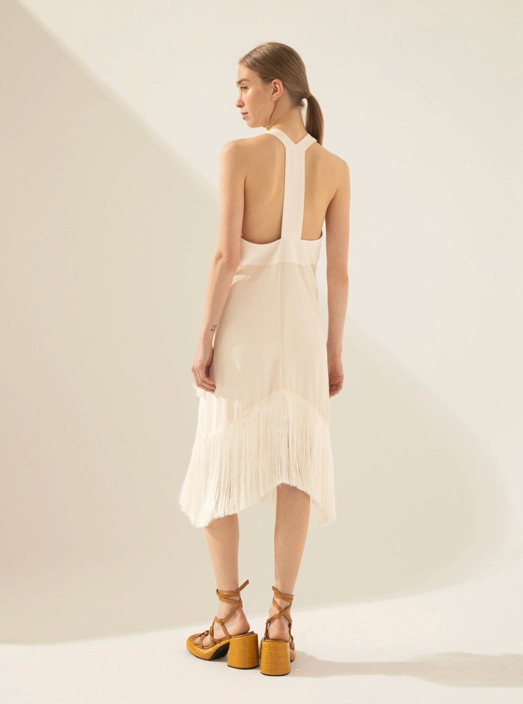 Sleeveless dress, knee-length. Features fringe detailing on the front and around the hem. Back zip fastening. An ideal piece to complete your outfits this season.