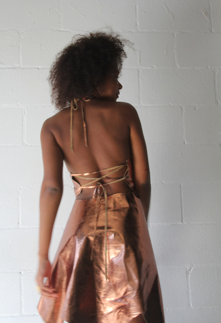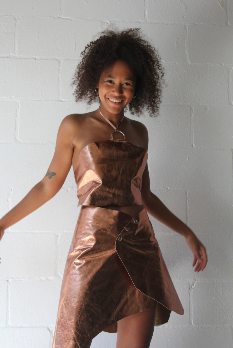 Leather top with hardware at the neck. One size fits most, adjustable with ties at the back. Looks PERFECT with the Moss Skirt.