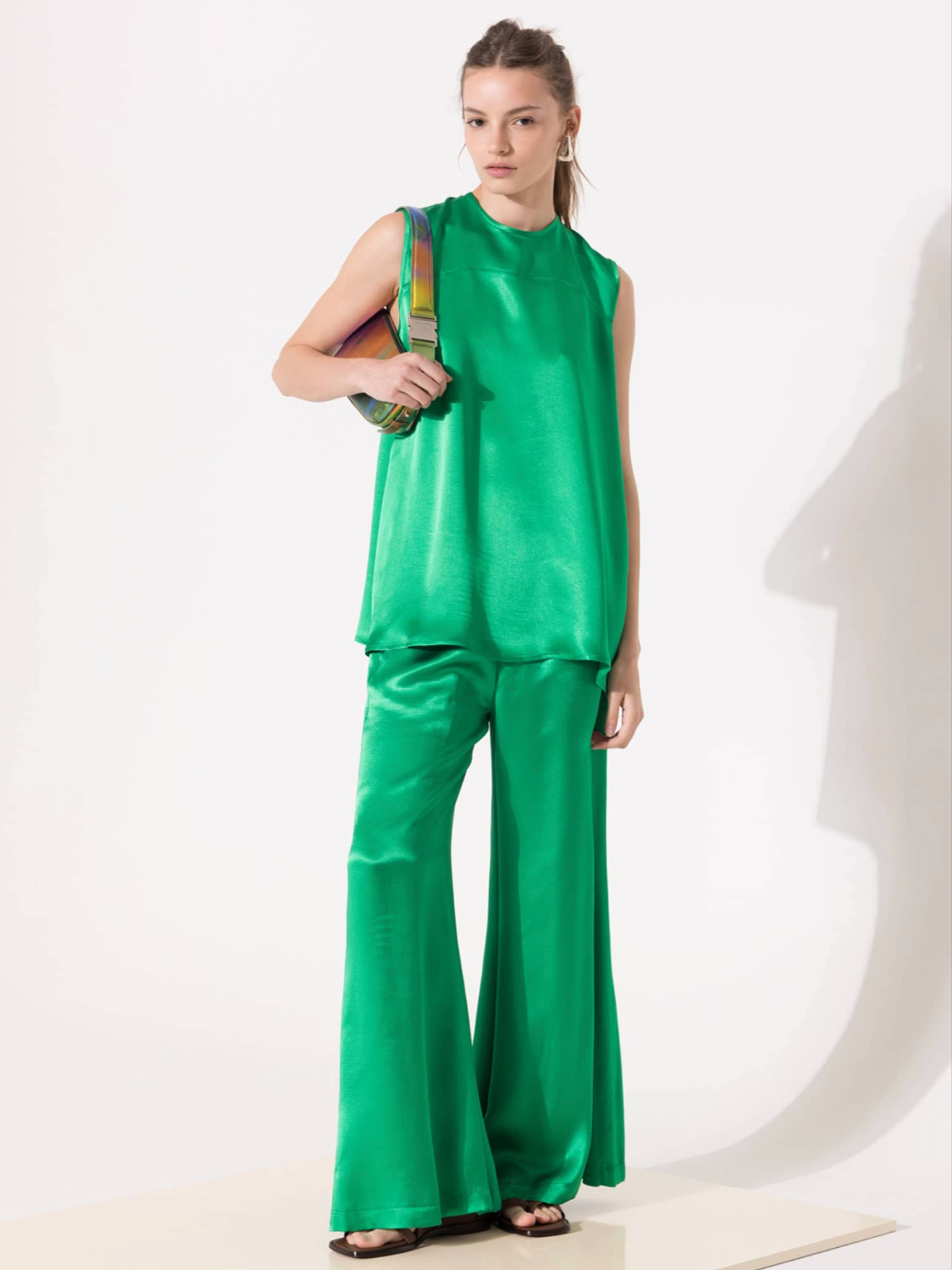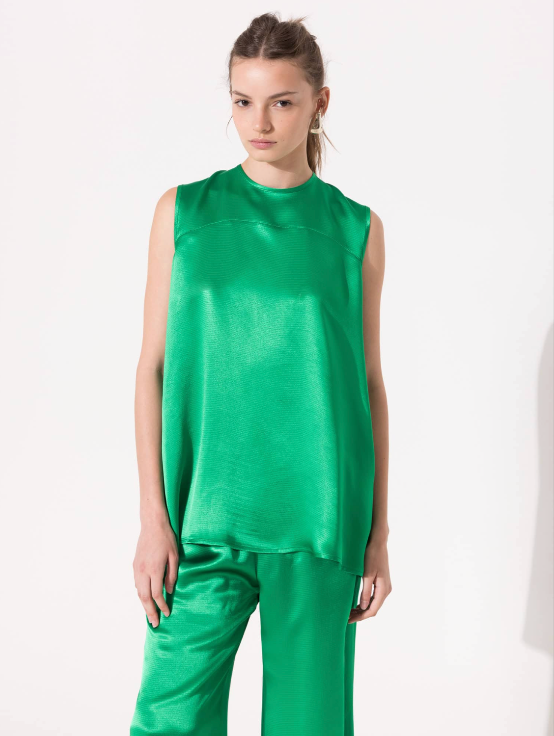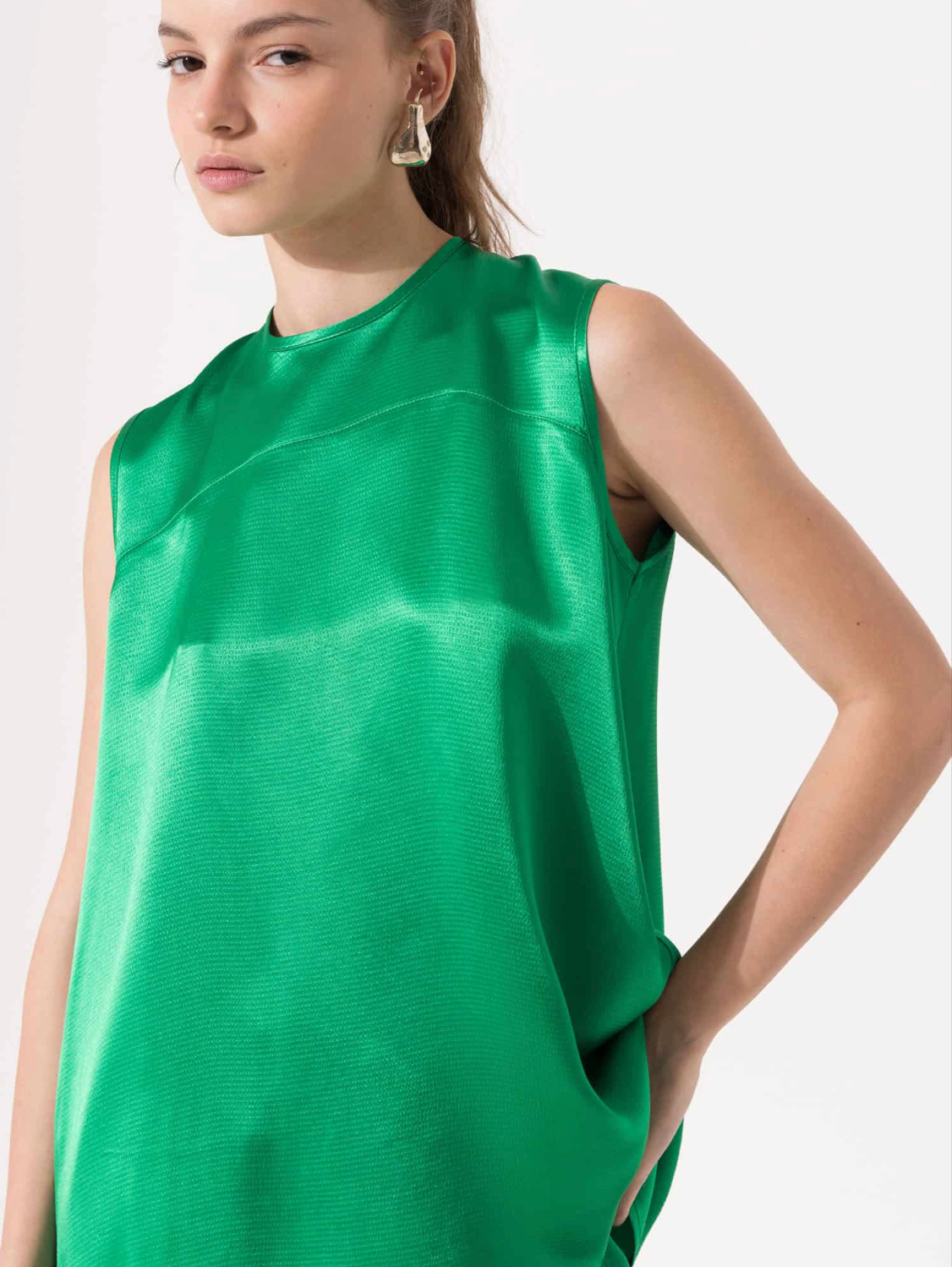 Josefina top made of satin. Regular fit, sleeveless, below-the-hip length. Features a teardrop opening at the center back with a buttonhole. A yoke detail adds fullness to the garment.